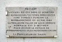 - Voir le billet du 29 mai 2007 écrit par Patrick Allemand, vice-président du Conseil général des Alpes-Maritimes, pour les commémorations du 63e anniversaire du bombardement du 26 mai 1944.