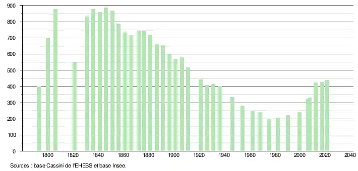 L'évolution du nombre d'habitants est connue à travers les recensements de la population effectués dans la commune depuis 1793. Pour les communes de moins de 10 000 habitants, une enquête de recensement portant sur toute la population est réalisée tous les cinq ans, les populations légales des années intermédiaires étant quant à elles estimées par interpolation ou extrapolation[28]. Pour la commune, le premier recensement exhaustif entrant dans le cadre du nouveau dispositif a été réalisé en 2007[29].