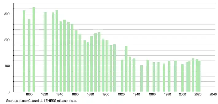 L'évolution du nombre d'habitants est connue à travers les recensements de la population effectués dans la commune depuis 1793. Pour les communes de moins de 10 000 habitants, une enquête de recensement portant sur toute la population est réalisée tous les cinq ans, les populations légales des années intermédiaires étant quant à elles estimées par interpolation ou extrapolation[25]. Pour la commune, le premier recensement exhaustif entrant dans le cadre du nouveau dispositif a été réalisé en 2008[26].