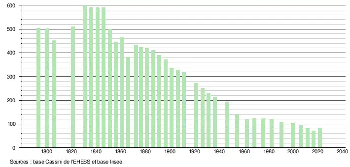 L'évolution du nombre d'habitants est connue à travers les recensements de la population effectués dans la commune depuis 1793. Pour les communes de moins de 10 000 habitants, une enquête de recensement portant sur toute la population est réalisée tous les cinq ans, les populations légales des années intermédiaires étant quant à elles estimées par interpolation ou extrapolation[26]. Pour la commune, le premier recensement exhaustif entrant dans le cadre du nouveau dispositif a été réalisé en 2006[27].