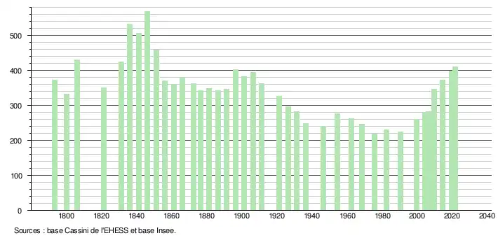 L'évolution du nombre d'habitants est connue à travers les recensements de la population effectués dans la commune depuis 1793. Pour les communes de moins de 10 000 habitants, une enquête de recensement portant sur toute la population est réalisée tous les cinq ans, les populations légales des années intermédiaires étant quant à elles estimées par interpolation ou extrapolation[19]. Pour la commune, le premier recensement exhaustif entrant dans le cadre du nouveau dispositif a été réalisé en 2004[20].