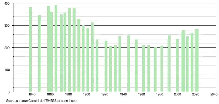L'évolution du nombre d'habitants est connue à travers les recensements de la population effectués dans la commune depuis 1838. Pour les communes de moins de 10 000 habitants, une enquête de recensement portant sur toute la population est réalisée tous les cinq ans, les populations légales des années intermédiaires étant quant à elles estimées par interpolation ou extrapolation[14]. Pour la commune, le premier recensement exhaustif entrant dans le cadre du nouveau dispositif a été réalisé en 2005[15].