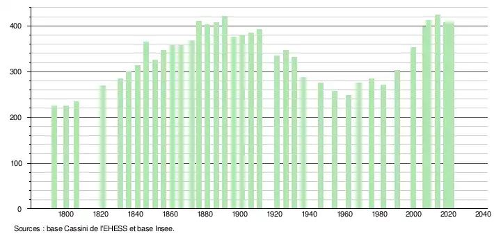 L'évolution du nombre d'habitants est connue à travers les recensements de la population effectués dans la commune depuis 1793. Pour les communes de moins de 10 000 habitants, une enquête de recensement portant sur toute la population est réalisée tous les cinq ans, les populations légales des années intermédiaires étant quant à elles estimées par interpolation ou extrapolation[24]. Pour la commune, le premier recensement exhaustif entrant dans le cadre du nouveau dispositif a été réalisé en 2008[25].