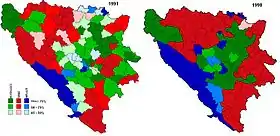À la suite des déclarations d'indépendance de la Slovénie et de la Croatie vis-à-vis de la Yougoslavie, une scission importante s'est développée parmi les résidents de Bosnie-Herzégovine sur la question de savoir s'il fallait rester en Yougoslavie (très majoritairement favorisée par les Serbes) ou rechercher l'indépendance (très majoritairement favorisée par les Bosniaques et les Croates)[43].