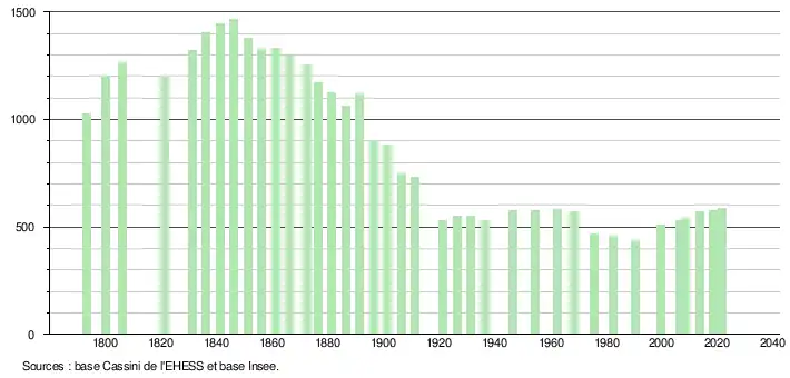 L'évolution du nombre d'habitants est connue à travers les recensements de la population effectués dans la commune depuis 1793. Pour les communes de moins de 10 000 habitants, une enquête de recensement portant sur toute la population est réalisée tous les cinq ans, les populations légales des années intermédiaires étant quant à elles estimées par interpolation ou extrapolation[19]. Pour la commune, le premier recensement exhaustif entrant dans le cadre du nouveau dispositif a été réalisé en 2008[20].