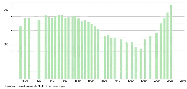 L'évolution du nombre d'habitants est connue à travers les recensements de la population effectués dans la commune depuis 1793. Pour les communes de moins de 10 000 habitants, une enquête de recensement portant sur toute la population est réalisée tous les cinq ans, les populations légales des années intermédiaires étant quant à elles estimées par interpolation ou extrapolation[29]. Pour la commune, le premier recensement exhaustif entrant dans le cadre du nouveau dispositif a été réalisé en 2006[30].