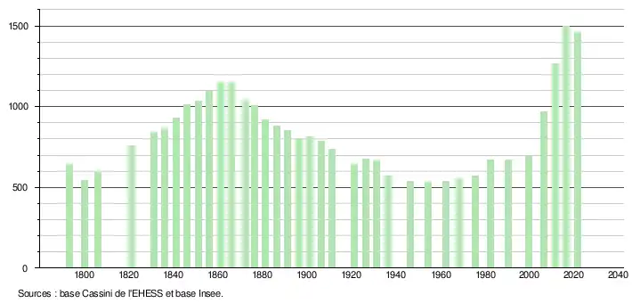 L'évolution du nombre d'habitants est connue à travers les recensements de la population effectués dans la commune depuis 1793. Pour les communes de moins de 10 000 habitants, une enquête de recensement portant sur toute la population est réalisée tous les cinq ans, les populations légales des années intermédiaires étant quant à elles estimées par interpolation ou extrapolation[22]. Pour la commune, le premier recensement exhaustif entrant dans le cadre du nouveau dispositif a été réalisé en 2006[23].