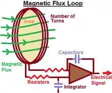 Une boucle de flux magnétique est une boucle de fil conducteur. Lorsque le champ magnétique qui traverse la boucle varie, il génère une tension par la loi d'induction de Faraday, générant un courant électrique. Celui-ci peut être mesuré, ce qui permet de déduire le flux magnétique. La tension induite est déterminée par[1] :