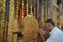 Fidèle recueilli devant le temple de la Mahabodhi, à Bodhgaya, haut lieu de pèlerinage bouddhique.