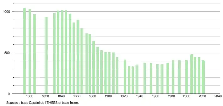 L'évolution du nombre d'habitants est connue à travers les recensements de la population effectués dans la commune depuis 1793. Pour les communes de moins de 10 000 habitants, une enquête de recensement portant sur toute la population est réalisée tous les cinq ans, les populations légales des années intermédiaires étant quant à elles estimées par interpolation ou extrapolation[28]. Pour la commune, le premier recensement exhaustif entrant dans le cadre du nouveau dispositif a été réalisé en 2005[29].