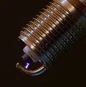 Un perfectionnement possible des bougies d'allumage consiste à réaliser une électrode centrale avec une entaille en « V »[Note 4]. Grâce à cette réalisation, l'arc électrique ne se forme pas au centre de l'électrode mais à sa périphérie, ce qui améliore la combustion des gaz[23].