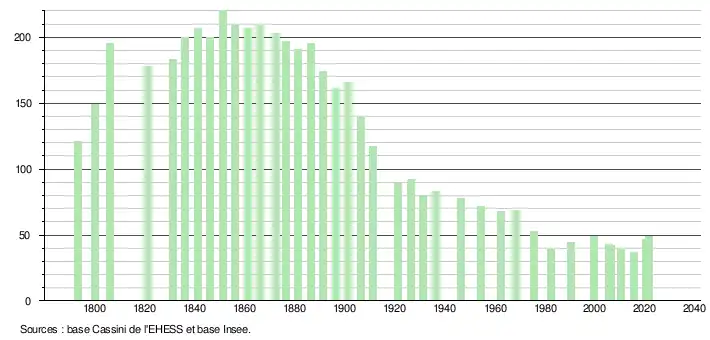 L'évolution du nombre d'habitants est connue à travers les recensements de la population effectués dans la commune depuis 1793. Pour les communes de moins de 10 000 habitants, une enquête de recensement portant sur toute la population est réalisée tous les cinq ans, les populations légales des années intermédiaires étant quant à elles estimées par interpolation ou extrapolation[13]. Pour la commune, le premier recensement exhaustif entrant dans le cadre du nouveau dispositif a été réalisé en 2005[14].