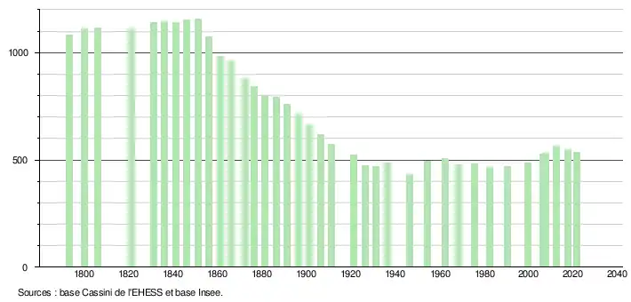 L'évolution du nombre d'habitants est connue à travers les recensements de la population effectués dans la commune depuis 1793. Pour les communes de moins de 10 000 habitants, une enquête de recensement portant sur toute la population est réalisée tous les cinq ans, les populations légales des années intermédiaires étant quant à elles estimées par interpolation ou extrapolation[17]. Pour la commune, le premier recensement exhaustif entrant dans le cadre du nouveau dispositif a été réalisé en 2007[18].