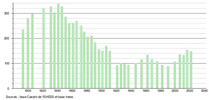 L'évolution du nombre d'habitants est connue à travers les recensements de la population effectués dans la commune depuis 1793. Pour les communes de moins de 10 000 habitants, une enquête de recensement portant sur toute la population est réalisée tous les cinq ans, les populations légales des années intermédiaires étant quant à elles estimées par interpolation ou extrapolation[26]. Pour la commune, le premier recensement exhaustif entrant dans le cadre du nouveau dispositif a été réalisé en 2006[27].
