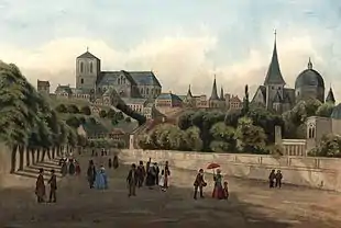 Perspective vers la Sauvenière vue du pont d'Avroy en 1826. À l'arrière plan, la collégiale Saint-Jean et la Basilique Saint-Martin.