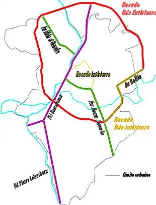- La rocade intermédiaire doit proposer aux riverains un cercle complet à mi distance entre les boulevards extérieurs et le centre-ville. Le projet est lancé en 1970 et sera abandonné en 1975. La principale raison est le coût des très nombreuses destructions devant être pratiquées afin de réaliser un tel tracé. La ville s'étant étendue de façon anarchique, il aurait fallu entièrement repenser la gestion des quartiers. Néanmoins, une rocade intérieure, dite rocade intérieure de distribution sera plus ou moins réalisée et permettra d'enserrer la totalité du secteur centre via un ensemble cohérent de boulevards et de grandes rues. Une trémie et un auto-pont aujourd'hui disparu en permettaient le franchissement.