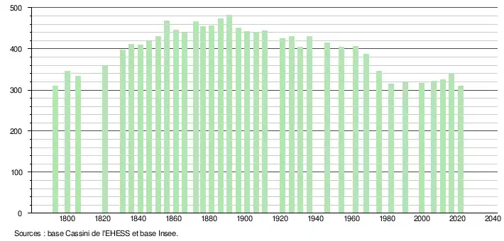 L'évolution du nombre d'habitants est connue à travers les recensements de la population effectués dans la commune depuis 1793. Pour les communes de moins de 10 000 habitants, une enquête de recensement portant sur toute la population est réalisée tous les cinq ans, les populations légales des années intermédiaires étant quant à elles estimées par interpolation ou extrapolation[25]. Pour la commune, le premier recensement exhaustif entrant dans le cadre du nouveau dispositif a été réalisé en 2006[26].
