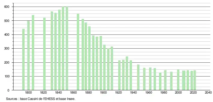 L'évolution du nombre d'habitants est connue à travers les recensements de la population effectués dans la commune depuis 1793. Pour les communes de moins de 10 000 habitants, une enquête de recensement portant sur toute la population est réalisée tous les cinq ans, les populations légales des années intermédiaires étant quant à elles estimées par interpolation ou extrapolation[18]. Pour la commune, le premier recensement exhaustif entrant dans le cadre du nouveau dispositif a été réalisé en 2007[19].