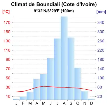 Le climat, qualifié de « climat soudanais »[Note 3], est tropical sec de savane, classé de type As (Classification de Köppen). Ce climat chaud se caractérise par une très longue saison sèche, d'octobre à mai et une saison des pluies marquée par deux maxima pluviométriques, l'un en juin et l'autre en septembre. Pendant la saison des pluies, les précipitations peuvent se prolonger pendant une semaine sans interruption, ou tomber violemment pendant quelques heures avant que le soleil ne réapparaisse. On compte en moyenne 77 jours de pluies par an dans le département de Boundiali, le total des précipitations annuelles se situent autour des 1 300 à 1 500 mm[4]. Les températures varient peu, allant de 21 à 35 °C[5],[6]. En mai, la température de l’air avoisine les 32 °C. En janvier et février, les mois les plus froids, l'harmattan, un vent puissant venu du Sahara abaisse considérablement la température qui se situe toutefois toujours aux alentours de 20 °C. Il arrive parfois que des vents de sable, issus du désert malien, atteignent la région et la recouvrent d'une couleur ocre.