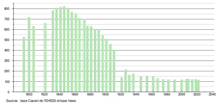 L'évolution du nombre d'habitants est connue à travers les recensements de la population effectués dans la commune depuis 1793. Pour les communes de moins de 10 000 habitants, une enquête de recensement portant sur toute la population est réalisée tous les cinq ans, les populations légales des années intermédiaires étant quant à elles estimées par interpolation ou extrapolation[16]. Pour la commune, le premier recensement exhaustif entrant dans le cadre du nouveau dispositif a été réalisé en 2008[17].