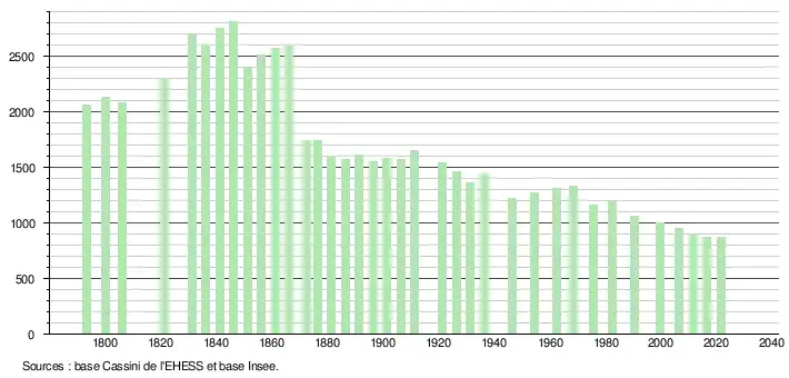 L'évolution du nombre d'habitants est connue à travers les recensements de la population effectués dans la commune depuis 1793. Pour les communes de moins de 10 000 habitants, une enquête de recensement portant sur toute la population est réalisée tous les cinq ans, les populations légales des années intermédiaires étant quant à elles estimées par interpolation ou extrapolation[30]. Pour la commune, le premier recensement exhaustif entrant dans le cadre du nouveau dispositif a été réalisé en 2006[31].