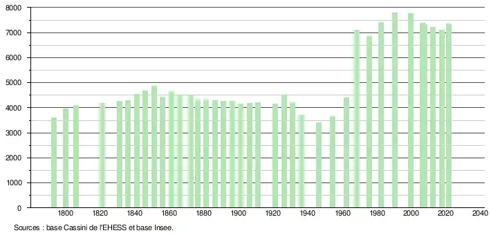 L'évolution du nombre d'habitants est connue à travers les recensements de la population effectués dans la commune depuis 1793. Pour les communes de moins de 10 000 habitants, une enquête de recensement portant sur toute la population est réalisée tous les cinq ans, les populations légales des années intermédiaires étant quant à elles estimées par interpolation ou extrapolation[26]. Pour la commune, le premier recensement exhaustif entrant dans le cadre du nouveau dispositif a été réalisé en 2007[27].