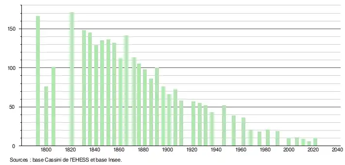 L'évolution du nombre d'habitants est connue à travers les recensements de la population effectués dans la commune depuis 1793. Pour les communes de moins de 10 000 habitants, une enquête de recensement portant sur toute la population est réalisée tous les cinq ans, les populations légales des années intermédiaires étant quant à elles estimées par interpolation ou extrapolation[36]. Pour la commune, le premier recensement exhaustif entrant dans le cadre du nouveau dispositif a été réalisé en 2006[37].