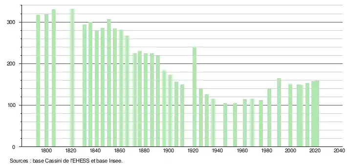 L'évolution du nombre d'habitants est connue à travers les recensements de la population effectués dans la commune depuis 1793. Pour les communes de moins de 10 000 habitants, une enquête de recensement portant sur toute la population est réalisée tous les cinq ans, les populations légales des années intermédiaires étant quant à elles estimées par interpolation ou extrapolation[16]. Pour la commune, le premier recensement exhaustif entrant dans le cadre du nouveau dispositif a été réalisé en 2008[17].