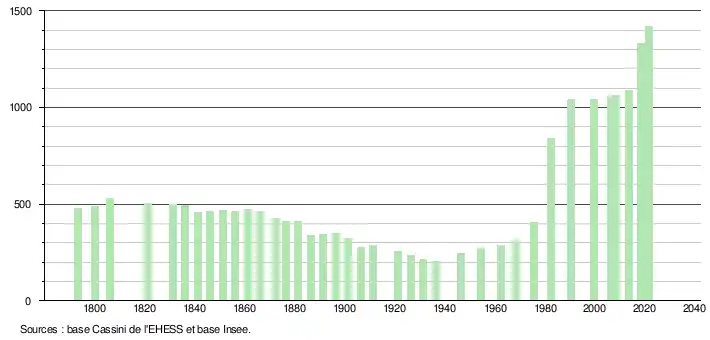 L'évolution du nombre d'habitants est connue à travers les recensements de la population effectués dans la commune depuis 1793. Pour les communes de moins de 10 000 habitants, une enquête de recensement portant sur toute la population est réalisée tous les cinq ans, les populations légales des années intermédiaires étant quant à elles estimées par interpolation ou extrapolation[14]. Pour la commune, le premier recensement exhaustif entrant dans le cadre du nouveau dispositif a été réalisé en 2008[15].
