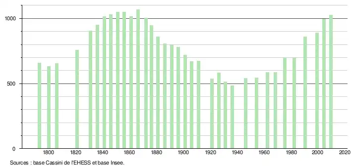 L'évolution du nombre d'habitants est connue à travers les recensements de la population effectués dans la commune depuis 1793. À partir du , les populations légales des communes sont publiées annuellement dans le cadre d'un recensement qui repose désormais sur une collecte d'information annuelle, concernant successivement tous les territoires communaux au cours d'une période de cinq ans. Pour les communes de moins de 10 000 habitants, une enquête de recensement portant sur toute la population est réalisée tous les cinq ans, les populations légales des années intermédiaires étant quant à elles estimées par interpolation ou extrapolation[5]. Pour la commune, le premier recensement exhaustif entrant dans le cadre du nouveau dispositif a été réalisé en 2004[6],[Note 1].