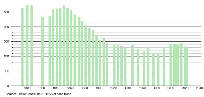 L'évolution du nombre d'habitants est connue à travers les recensements de la population effectués dans la commune depuis 1793. Pour les communes de moins de 10 000 habitants, une enquête de recensement portant sur toute la population est réalisée tous les cinq ans, les populations légales des années intermédiaires étant quant à elles estimées par interpolation ou extrapolation[39]. Pour la commune, le premier recensement exhaustif entrant dans le cadre du nouveau dispositif a été réalisé en 2004[40].