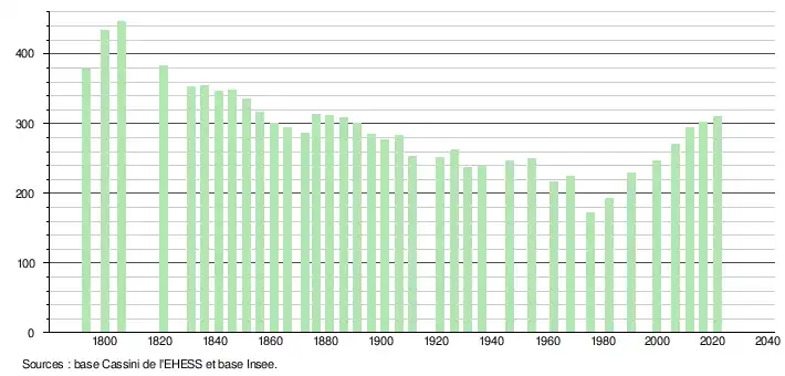 L'évolution du nombre d'habitants est connue à travers les recensements de la population effectués dans la commune depuis 1793. Pour les communes de moins de 10 000 habitants, une enquête de recensement portant sur toute la population est réalisée tous les cinq ans, les populations légales des années intermédiaires étant quant à elles estimées par interpolation ou extrapolation[26]. Pour la commune, le premier recensement exhaustif entrant dans le cadre du nouveau dispositif a été réalisé en 2006[27].