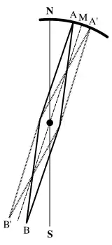 Cette méthode (fig. 10) est une correction nécessaire pour déterminer correctement le méridien magnétique. Les aiguilles aimantées comprennent en fait deux axes : l'un est l'axe de la figure ou son axe de symétrie, par exemple celui qui passe par les pointes (A et B) d'une aiguille en forme de losange ; l'autre est l'axe des pôles de cet objet, c'est-à-dire l'axe qui passe par les deux pôles de l'aimant et qui donc s'aligne avec le méridien magnétique (M). Ces deux axes ne sont pas strictement confondus. On s'affranchit de cette différence en inversant les faces de l'aiguille sur sa suspension. Les positions d'une des pointes de l'aiguille (A et A') sont alors symétriques par rapport à la ligne des pôles. En mesurant la position de l'aiguille sur chacune des faces (A et A'), la moyenne indique la position réelle du méridien magnétique. La déclinaison équivaut à .