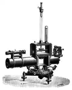 Au début des années 1800 des appareils plus sophistiqués sont fabriqués, tels que le théodolite-boussole de Brünner[20] (fig. 6) qui permet de mesurer à la fois la déclinaison, l'inclinaison et l'intensité du champ magnétique. En 1832, grâce aux travaux de Gauss et Weber, on voit apparaître les premiers magnétomètres, unifilaire pour mesurer la déclinaison et bifilaire pour mesurer les variations de la déclinaison. Vers 1850 apparaissent des appareils à enregistrement photographique, comme le déclinomètre enregistreur de Gauss, ou celui de Brooke (en), des instruments qui s’avèrent utiles pour les observations des variations diurnes car ils épargnent à l'observateur une présence assidue. À l'Oservatoire de Kew, on utilise à la même époque un déclinomètre (fig. 7) avec, à la place d'une aiguille, un tube aimanté, faisant office de collimateur, à travers lequel on fait passer un faisceau de lumière, réfléchi par un miroir, pour obtenir l'angle de déclinaison[21],[22]. De nos jours on utilise encore le magnétomètre, qui n'a pas cessé d'évoluer depuis.