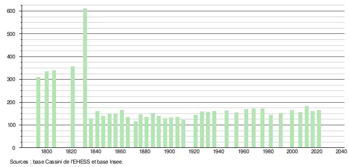 L'évolution du nombre d'habitants est connue à travers les recensements de la population effectués dans la commune depuis 1793. Pour les communes de moins de 10 000 habitants, une enquête de recensement portant sur toute la population est réalisée tous les cinq ans, les populations légales des années intermédiaires étant quant à elles estimées par interpolation ou extrapolation[26]. Pour la commune, le premier recensement exhaustif entrant dans le cadre du nouveau dispositif a été réalisé en 2006[27].