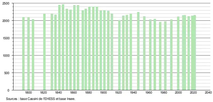 L'évolution du nombre d'habitants est connue à travers les recensements de la population effectués dans la commune depuis 1793. Pour les communes de moins de 10 000 habitants, une enquête de recensement portant sur toute la population est réalisée tous les cinq ans, les populations légales des années intermédiaires étant quant à elles estimées par interpolation ou extrapolation[27]. Pour la commune, le premier recensement exhaustif entrant dans le cadre du nouveau dispositif a été réalisé en 2008[28].