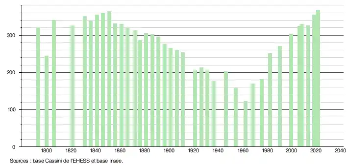L'évolution du nombre d'habitants est connue à travers les recensements de la population effectués dans la commune depuis 1793. Pour les communes de moins de 10 000 habitants, une enquête de recensement portant sur toute la population est réalisée tous les cinq ans, les populations légales des années intermédiaires étant quant à elles estimées par interpolation ou extrapolation[23]. Pour la commune, le premier recensement exhaustif entrant dans le cadre du nouveau dispositif a été réalisé en 2008[24].