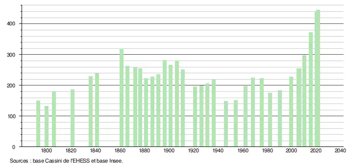 L'évolution du nombre d'habitants est connue à travers les recensements de la population effectués dans la commune depuis 1793. Pour les communes de moins de 10 000 habitants, une enquête de recensement portant sur toute la population est réalisée tous les cinq ans, les populations légales des années intermédiaires étant quant à elles estimées par interpolation ou extrapolation[20]. Pour la commune, le premier recensement exhaustif entrant dans le cadre du nouveau dispositif a été réalisé en 2005[21].
