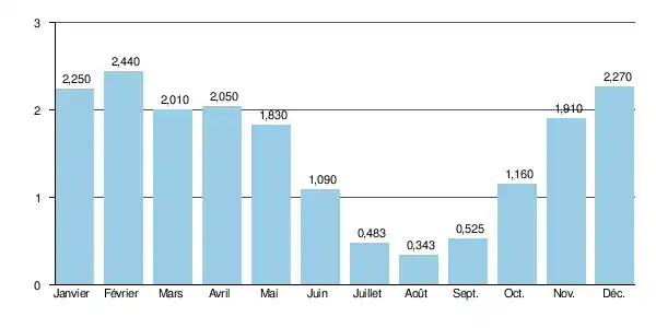 Aux étiages, le VCN3 peut chuter jusque 0,006 m3/s, en cas de période quinquennale sèche, soit seulement 6 litres par seconde, le cours d'eau tombant presque à sec.
