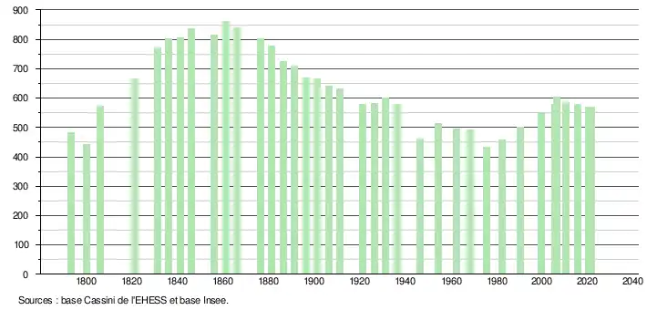 L'évolution du nombre d'habitants est connue à travers les recensements de la population effectués dans la commune depuis 1793. Pour les communes de moins de 10 000 habitants, une enquête de recensement portant sur toute la population est réalisée tous les cinq ans, les populations légales des années intermédiaires étant quant à elles estimées par interpolation ou extrapolation[17]. Pour la commune, le premier recensement exhaustif entrant dans le cadre du nouveau dispositif a été réalisé en 2005[18].