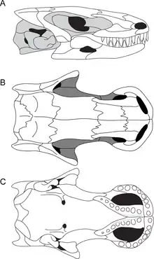 Dessins du crâne de Brachydectes newberryi. De haut en bas : Vues A) latérale, B) dorsale et C) palatale.
