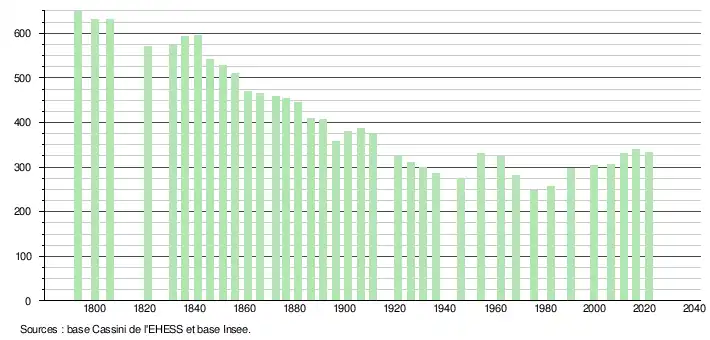 L'évolution du nombre d'habitants est connue à travers les recensements de la population effectués dans la commune depuis 1793. Pour les communes de moins de 10 000 habitants, une enquête de recensement portant sur toute la population est réalisée tous les cinq ans, les populations légales des années intermédiaires étant quant à elles estimées par interpolation ou extrapolation[21]. Pour la commune, le premier recensement exhaustif entrant dans le cadre du nouveau dispositif a été réalisé en 2006[22].
