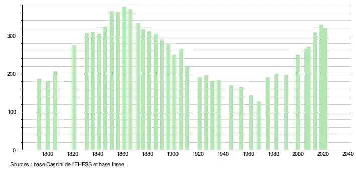 L'évolution du nombre d'habitants est connue à travers les recensements de la population effectués dans la commune depuis 1793. Pour les communes de moins de 10 000 habitants, une enquête de recensement portant sur toute la population est réalisée tous les cinq ans, les populations légales des années intermédiaires étant quant à elles estimées par interpolation ou extrapolation[24]. Pour la commune, le premier recensement exhaustif entrant dans le cadre du nouveau dispositif a été réalisé en 2008[25].