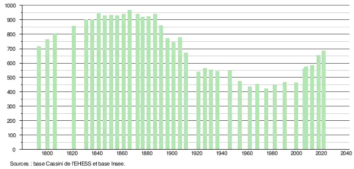 L'évolution du nombre d'habitants est connue à travers les recensements de la population effectués dans la commune depuis 1793. Pour les communes de moins de 10 000 habitants, une enquête de recensement portant sur toute la population est réalisée tous les cinq ans, les populations légales des années intermédiaires étant quant à elles estimées par interpolation ou extrapolation[18]. Pour la commune, le premier recensement exhaustif entrant dans le cadre du nouveau dispositif a été réalisé en 2007[19].