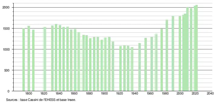L'évolution du nombre d'habitants est connue à travers les recensements de la population effectués dans la commune depuis 1793. Pour les communes de moins de 10 000 habitants, une enquête de recensement portant sur toute la population est réalisée tous les cinq ans, les populations légales des années intermédiaires étant quant à elles estimées par interpolation ou extrapolation[20]. Pour la commune, le premier recensement exhaustif entrant dans le cadre du nouveau dispositif a été réalisé en 2004[21].