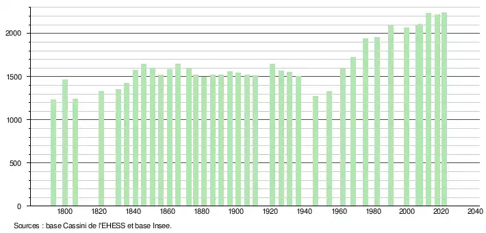 L'évolution du nombre d'habitants est connue à travers les recensements de la population effectués dans la commune depuis 1793. Pour les communes de moins de 10 000 habitants, une enquête de recensement portant sur toute la population est réalisée tous les cinq ans, les populations légales des années intermédiaires étant quant à elles estimées par interpolation ou extrapolation[36]. Pour la commune, le premier recensement exhaustif entrant dans le cadre du nouveau dispositif a été réalisé en 2007[37].