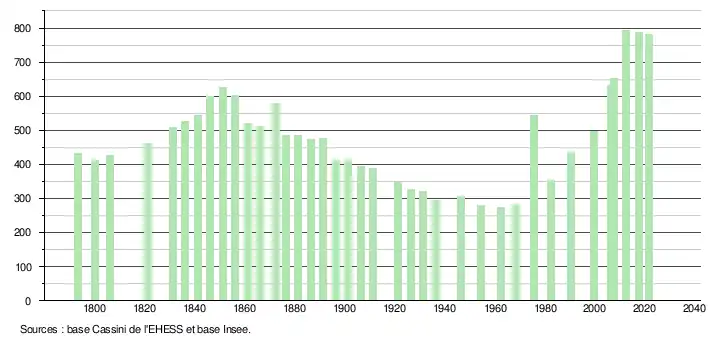 L'évolution du nombre d'habitants est connue à travers les recensements de la population effectués dans la commune depuis 1793. Pour les communes de moins de 10 000 habitants, une enquête de recensement portant sur toute la population est réalisée tous les cinq ans, les populations légales des années intermédiaires étant quant à elles estimées par interpolation ou extrapolation[15]. Pour la commune, le premier recensement exhaustif entrant dans le cadre du nouveau dispositif a été réalisé en 2007[16].