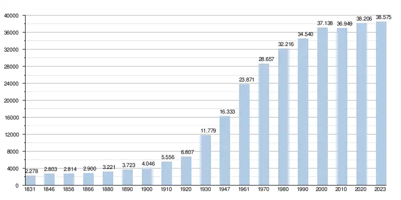 Elle comptait, au , 38 232 habitants (18 354 hommes et 19 878 femmes), soit une densité de 993,30 habitants/km2[3] pour une superficie de 38,49 km2.
