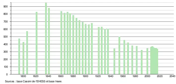 L'évolution du nombre d'habitants est connue à travers les recensements de la population effectués dans la commune depuis 1793. Pour les communes de moins de 10 000 habitants, une enquête de recensement portant sur toute la population est réalisée tous les cinq ans, les populations légales des années intermédiaires étant quant à elles estimées par interpolation ou extrapolation[21]. Pour la commune, le premier recensement exhaustif entrant dans le cadre du nouveau dispositif a été réalisé en 2005[22].