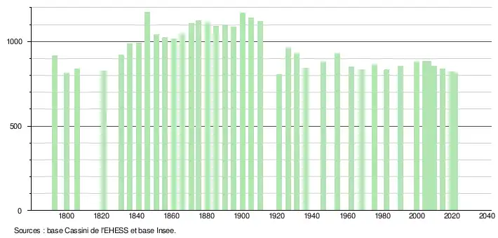 L'évolution du nombre d'habitants est connue à travers les recensements de la population effectués dans la commune depuis 1793. Pour les communes de moins de 10 000 habitants, une enquête de recensement portant sur toute la population est réalisée tous les cinq ans, les populations légales des années intermédiaires étant quant à elles estimées par interpolation ou extrapolation[22]. Pour la commune, le premier recensement exhaustif entrant dans le cadre du nouveau dispositif a été réalisé en 2004[23].